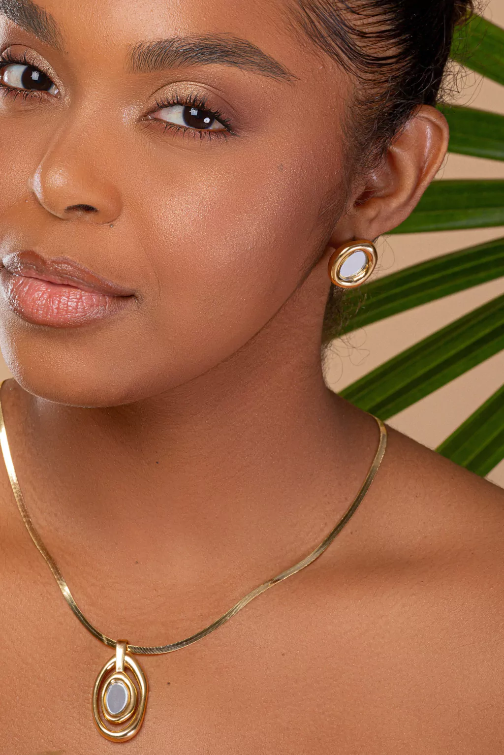 Com formas ovais e contornos assimétricos, este conjunto é perfeito para você, antenada nas tendências da moda. O destaque fica por conta do delicado detalhe em espelho, que traz toda a sedução e brilho, valorizando seu visual com um toque único e refinado.